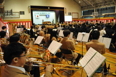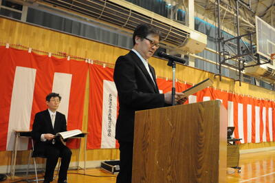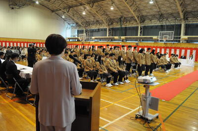すっかり春らしくなった日和のなか、本校PTA会長 足立敦子様、同窓会長 金山学様をはじめ11名の来賓の方々にご出席をいただき、入学式を挙行いたしました。緊張した面持ちの新入生115名が、吉田拓二校長から入学許可を受けました。