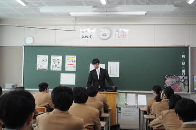 本校2年次「工業技術基礎」選択者21名に対して測量実習をしていただいた岩倉建設株式会社代表取締役社長 鈴木泰至 様に、感謝状を贈呈させていただきました。この測量実習は、総合学科になってから毎年実施していただいております。 岩倉建設株式会社様の最新機材を用いての測量実習は、本校工業教育に欠かせないものとなっております。若手職員の皆様により、年も近い高校生にわかりやすく説明をしていただいています。
